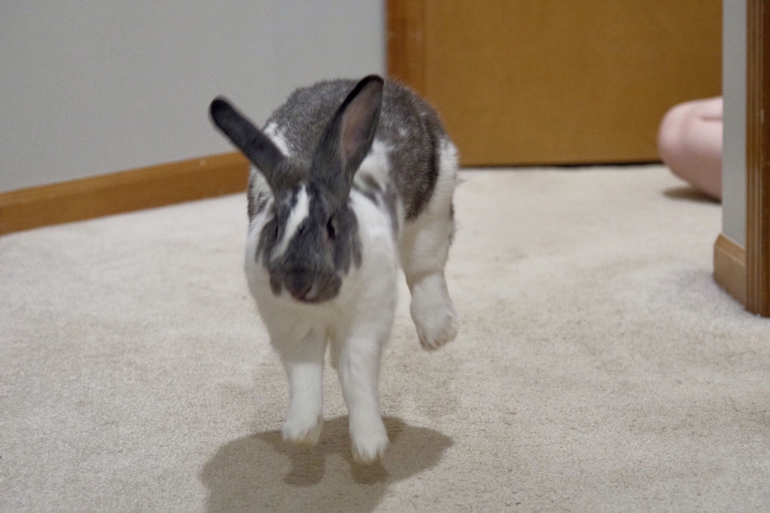 Raspberry (or Razzie or Razz) is a spunky boy. His long ears add to his personality with one solidly up and the other lopped. He was rescued on July 5th, 2024 from outside in a neighborhood and was estimated to be 2-3 months old at the time. He has a lot of energy and is curious and attention-seeking. He is not free-roam, as we have multiple bunnies, but we make sure he gets time to run around in a bigger area every day and he really needs this “recess time”. Razzie thinks he is Houdini and always checks the perimeter to see if he can escape from his pen. He likes to dig and pull, so we make sure he has cardboard and enrichment opportunities – bunny-proofing is a necessity. He’s not a fan of cloth (having a sheet on the floor) and prefers a cool, slick floor such as tile or wood – It’s better for running and then sliding across the floor. When I, his foster mom, step into his pen or his free roam area, he hops circles around my feet and craves attention. He likes to get pets and will either sit with me or hop around near me and boop me with his nose. One of his favorite activities is to smell his humans’ fingers and he also likes “scritches” on his head (when we rub the top of his head with our fingertips). Razzie also has a puzzle that he likes to spin around to get the treats out. He eats timothy hay and pellets, a little fruit (apple, blueberry, strawberry tops) and veggies (kale, brussel sprouts, green leaf lettuce, cilantro, parsley, carrot bits). He is neutered. Razzie always pees in his litter box and does fairly well pooping mostly in the litter box. Like most bunnies, he’s not a big fan of being picked up, but we have been able to pick him up when needed. Razzie may be interested in a bunny companion as he is always looking for attention and companionship and was pretty gentle when playing around our geriatric lady bun. If you are interested in Raspberry, please contact the Missouri House Rabbit Society of Kansas City.
